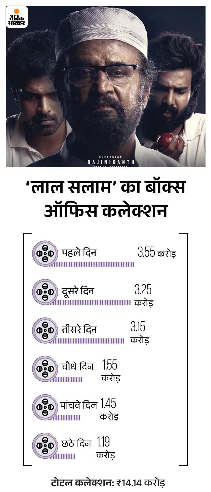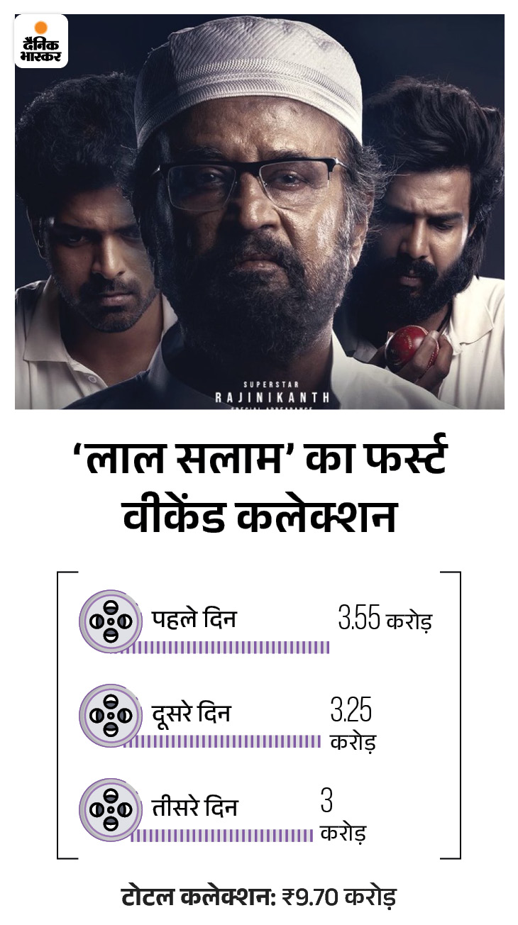 साउथ में रिलीज हुई रजनीकांत स्टारर ‘लाल सलाम’ फर्स्ट वीकेंड पर डबल डिजिट तक नहीं पहुंच पाई। ओपनिंग डे पर 3 करोड़ 55 लाख रुपए और दूसरे दिन 3 करोड़ 25 लाख रुपए कमाने के बाद तीसरे दिन यह फिल्म 3 करोड़ रुपए ही कमा पाई। इसका टोटल कलेक्शन 9 करोड़ 79 लाख रुपए हो गया है। इस फिल्म को रजनीकांत की बेटी ऐश्वर्या ने डायरेक्ट किया है। उन्होंने 9 साल बाद डायरेक्शन में वापसी की है।