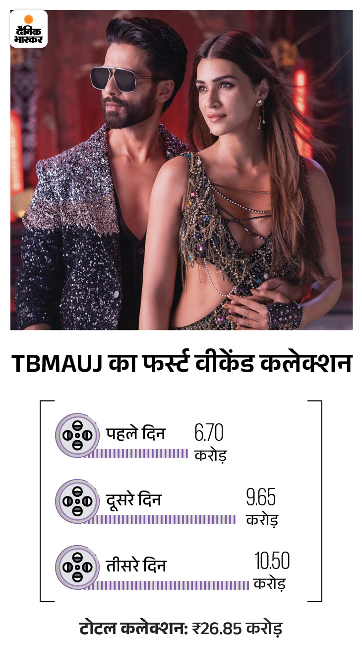 शाहिद कपूर और कृति सेनन की फिल्म ‘तेरी बातों में ऐसा उलझा जिया’ ने फर्स्ट वीकेंड पर 26 करोड़ 85 लाख रुपए का कलेक्शन किया है। पहले दिन 6 करोड़ 70 लाख रुपए और दूसरे दिन 9 करोड़ 65 लाख रुपए कमाने के बाद रविवार को तीसरे दिन इस फिल्म ने 10 करोड़ 50 लाख रुपए का कलेक्शन किया।